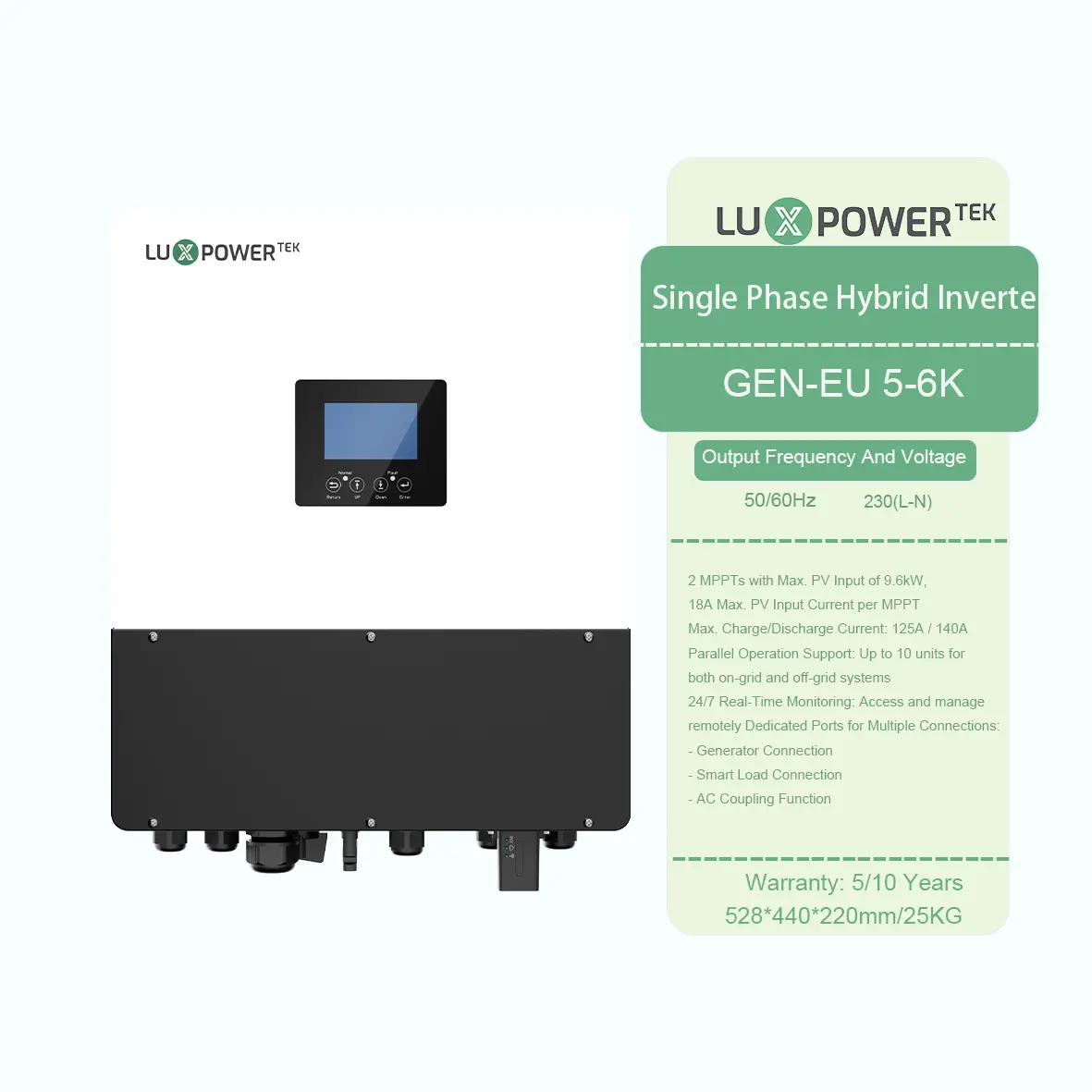 Der neueste Luxpower Gen2-LB-EU 3-6K ist das direkte Upgrade des Gen-LB-EU 3-6K, der überlegene Leistung und Belastbarkeit liefert. Mit Dual MPPT -Trackern maximiert es die Solarernte mit einem 9,6 -kW -maximalen PV -Eingang. Jedes MPPT unterstützt 18a und arbeitet effizient über einen breiten Eingangsbereich von 100–530 V.
