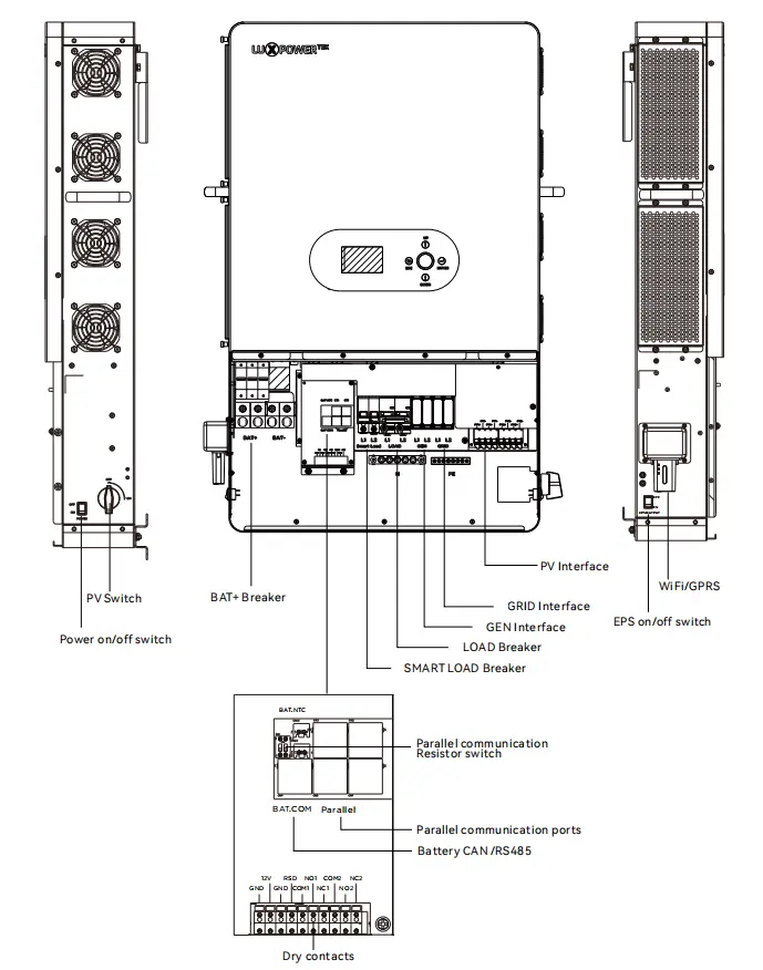 Der LuxPower SNA-US 12000 für Resilienz verfügt über zwei Wechselstromausgangsanschlüsse für die Mehrfachladungskonnektivität und eine robuste 100A kontinuierliche Pass-Through-Fähigkeit. Sein dedizierter Generatoranschluss und der nahtlose Übergang des Netzes/des Netzes sorgen für ein ununterbrochenes Stromversorgung unter anspruchsvollen Bedingungen.